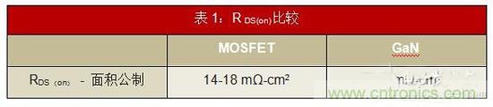 • 較低的RDS(on):如表1所示,GaN的MOSFET面積為RDS(on)的一半。這直接使電路中傳導損耗降低了50%。因此,您可以在設計中使用較小的散熱器和更簡單的熱管理。