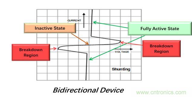 TISP的非線性電壓-電流特性通過轉(zhuǎn)移產(chǎn)生的電流來限制過壓。作為晶閘管,TISP具有非連續(xù)電壓-電流特性,它是由于高電壓區(qū)和低電壓區(qū)之間的切換動作而導致的。在TISP器件切換到低電壓狀態(tài)之前,它具有低阻抗接地路徑以分流瞬變能量,雪崩擊穿區(qū)域則導致了箝位動作。