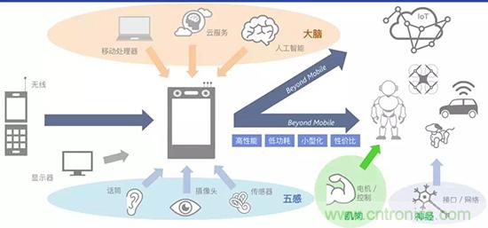 他指出按照這個(gè)原理疊加,如果再疊加人的肌肉----類似一些電機(jī)控制執(zhí)行器件,就形成了機(jī)器人的概念,再把低功耗小型化智能運(yùn)用就形成IOT物聯(lián)網(wǎng)概念,隨著技術(shù)的在進(jìn)步,智慧手機(jī)會(huì)超越了手機(jī)行業(yè)的范疇,逐步進(jìn)入到各個(gè)其他領(lǐng)域。如車載、機(jī)器人、穿戴設(shè)備,給其他周邊設(shè)備、周邊行業(yè)等,帶來革命性的產(chǎn)品形態(tài)變化。