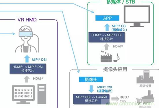 例如VR技術(shù),VR是使用高清晰的小型顯示設(shè)備,其實(shí)這是從原來的智能手機(jī)顯示屏發(fā)展而來。智能手機(jī)主要使用MIPI等接口方式,但是VR是從PC轉(zhuǎn)變來的,它采用了大量高清晰度圖像。主要使用HDMI接口。隨著手機(jī)進(jìn)入到VR領(lǐng)域,就會(huì)遇到接口不統(tǒng)一的挑戰(zhàn)。