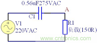 阻容降壓電路可以等效為由降壓電容C1和負(fù)載電阻R1組成,電阻和電容串聯(lián)分壓。