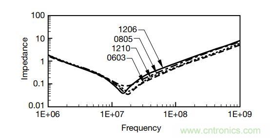 一般來(lái)說(shuō),直插件的引線較長(zhǎng),其寄生電感比SMD大;電解電容內(nèi)部有大量卷繞結(jié)構(gòu)的鋁箔,寄生電感比其它工藝的電容大。1206尺寸的MLCC內(nèi)部電極面積和焊接端子截面明顯比0805大,所以尺寸越大的MLCC,自諧振頻率就越低。