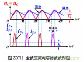 全波或橋式整流電容濾波的原理與半波整波電容濾波基本相同,濾波波形如圖Z0711 所示。
