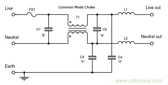 具有低連接電感的Y型電容器處在輸入線對(duì)地連接的位置。在這里, Y1或Y2電容器的額定瞬態(tài)電壓分別為8kV和5kV,如圖所示處在輸入線對(duì)地連接。針對(duì)漏電流的考慮限制了可以施加的電容量,雖然薄膜電容器的低連接電感有助于保持較高的自共振,但應(yīng)保持外部接地系統(tǒng)較短。