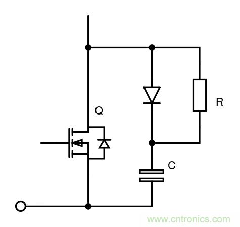 在開關(guān)緩沖電路中,電容器與電阻/二極管組合串聯(lián),并通過(guò)電源開關(guān)(通常為IGBT或MOSFET)連接,以控制dV/dt,如圖2所示。