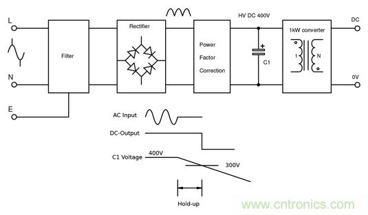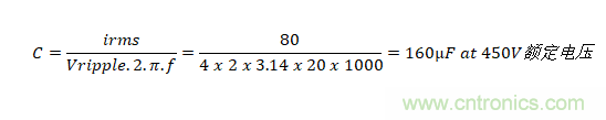 假設(shè)效率為90%,并且電壓降(Vd)為300V,低于該值,將會(huì)失去輸出調(diào)節(jié)功能。如果發(fā)生停電,當(dāng)總線電壓從400V降至300V時(shí),大容量電容器C1提供能量以保持恒定的輸出功率。 我們可以計(jì)算在電壓降至300V以下之前要進(jìn)行20ms穿越所需的C1值: