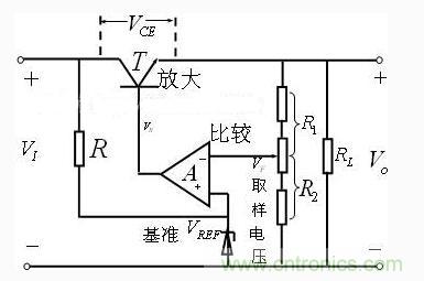 VI是整流濾波后的電壓,T為調(diào)整管,A為比較放大電路,VREF為基準電壓,它由穩(wěn)壓管Dz與限流電阻R構(gòu)成。R1與R2組成反饋網(wǎng)絡(luò),是用來反映輸出電壓變化的取樣環(huán)節(jié)。