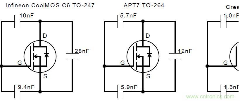從圖上可以看出,Inifineon6代MOS管和APT7代MOS管性能遠(yuǎn)遠(yuǎn)不如碳化硅性能,它的各個指標(biāo)都很小,當(dāng)米勒振蕩通過其他手段無法降低時,可以考慮更換更小的米勒電容MOS管,尤其需要重視Cgd要盡可能的小于Cgs。
