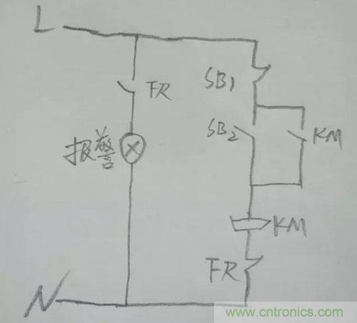 簡單描述一下這個圖。當(dāng)電動機(jī)工作正常的時候,熱繼電器的常閉觸點(diǎn)接通,常開觸點(diǎn)斷開,報警裝置不工作。如果電機(jī)出現(xiàn)故障,熱繼電器內(nèi)部的熱元件把常閉點(diǎn)斷開的同時,熱繼電器的常開點(diǎn)閉合,報警裝置形成回路,報警響起,提醒操作人員及時檢修。