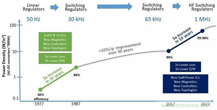 功率密度(AC-DC轉(zhuǎn)換器~300W);線性調(diào)節(jié)器;開關(guān)調(diào)節(jié)器;高頻開關(guān)調(diào)節(jié)器;新磁性元件;新控制器;新拓?fù)浣Y(jié)構(gòu);2倍低損耗;3倍低成本/W;10年5倍提升;超過(guò)30年每年<10%改善;十年5倍提升;新GaN功率IC;效率。