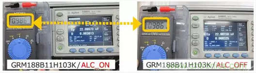 大容量和非大容量MLCC在ALC (Automatic Level Control )ON/OFF的狀態(tài)下測定靜電容量。結(jié)果如下。