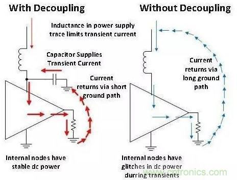 圖 2 闡述了為什么去耦非常重要。需要注意的是,電源線跡的電感將限制暫態(tài)電流。 去耦電容與器件非常接近,因此電流路徑的電感很小。在暫態(tài)過程中,該電容器可在非常短的時間內向器件提供超大量的電流。 未采用去耦電容的器件無法提供暫態(tài)電流,因此放大器的內部節(jié)點會下垂(通常稱為干擾)。無去耦電容的器件其內部電源干擾會導致器件工作不連續(xù),原因是內部節(jié)點未獲得正確的偏置。