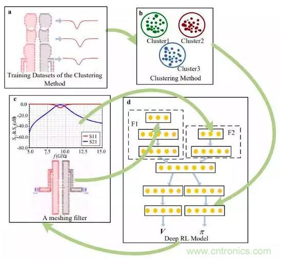 圖1:RINN架構(gòu)。a, 聚類算法的數(shù)據(jù)集,即網(wǎng)格模型的S參數(shù)變化矩陣。B,聚類算法。C、網(wǎng)格化的模型和S參數(shù)矩陣訓(xùn)練深度強(qiáng)化學(xué)習(xí)模型。d,以c為輸入,以動作的概率向量π和價(jià)值標(biāo)量v為輸出的深度強(qiáng)化學(xué)習(xí)模型。