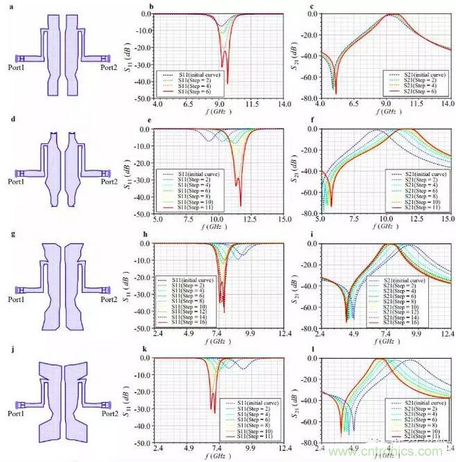 第二項(xiàng)任務(wù)和第三項(xiàng)任務(wù)的AI首先學(xué)會調(diào)整諧振器的長度,以達(dá)到移動中心頻率的目的,然后調(diào)整諧振器之間的耦合系數(shù),以減少通帶回波損耗,增加插入損耗,其設(shè)計(jì)過程如圖3(d-i)所示。