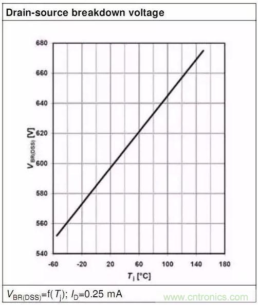 這個(gè)參數(shù)是有條件的,這個(gè)最小值600V是在Tj=25℃的值,也就是只有在Tj=25℃時(shí),MOSFET上電壓不超過600V才算是工作在安全狀態(tài)。