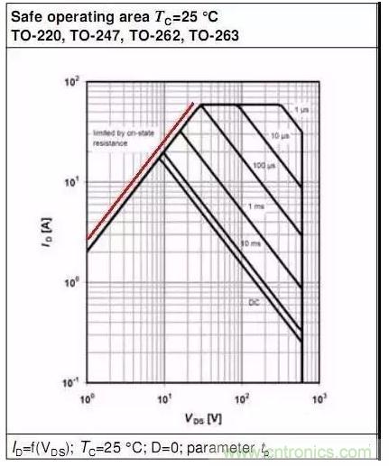 此圖中:當(dāng)VDS=1V時(shí),Y軸對(duì)應(yīng)的ID為2A,Rds=VDS/ID=0.5R ==>Tj=150℃時(shí),Rds(on)約為0.5R.當(dāng)VDS=10V時(shí),Y軸對(duì)應(yīng)的ID為20A,Rds=VDS/ID=0.5R ==>Tj=150℃時(shí),Rds(on)約為0.5R.所以,此部分曲線中,SOA表現(xiàn)為Tj_max時(shí)RDS(on)的限制.