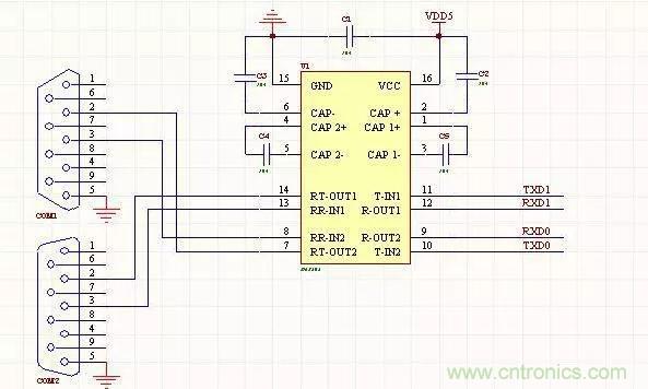 1、雙路232通信電路3線連接方式,對(duì)應(yīng)的是母頭,工作電壓5V,可以使用MAX202或MAX232.