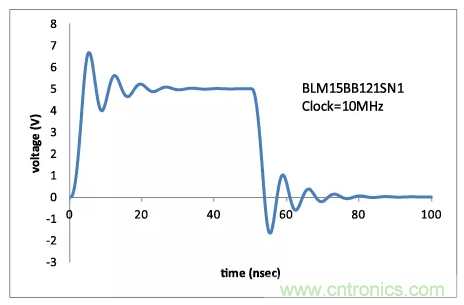 如果在數字電路中使用鐵氧體磁珠,則可能會發(fā)生波形中出現過沖和下沖的情況。(圖2)