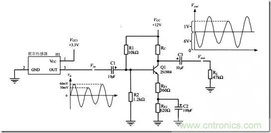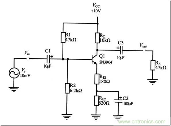 上圖是基極分壓式共射極放大電路,更為常用的電路圖如下圖所示:(圖中各參數(shù)值可以不用理會,僅作說明)