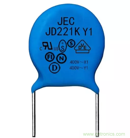 Y電容通常都是陶瓷類電容器,一般成隊(duì)出現(xiàn),多數(shù)是扁圓形外觀,顏色呈現(xiàn)藍(lán)色,能夠抑制共模干擾,Y電容容量是nF級(jí)?;诼╇娏鞯闹萍s,Y電容量不可很大。Y電容多數(shù)適用于隔離場(chǎng)合,按照IEC標(biāo)準(zhǔn),Y1產(chǎn)品電氣間隙最小為8.0㎜,Y2產(chǎn)品電氣間隙不低于6.3㎜,作為隔離產(chǎn)品,安全距離要做夠,避免高壓通電發(fā)生拉弧現(xiàn)象。