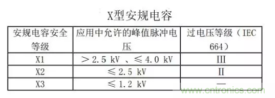 X型安規(guī)電容根據(jù)耐壓分為 X1、X2、X3三種,安規(guī)電容安全等級(jí)中允許的峰值脈沖電壓過電壓等級(jí):2.5kV<X1≤4.0kV、X2≤2.5kV、X3≤1.2kV