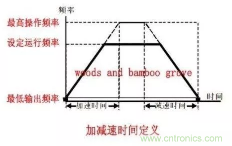 加速時間是指變頻器從【輸出最低頻率】(可設置如臺達01-00參數(shù))加速到【最高操作頻率】(可設置,如臺達01-05參數(shù))所需時間。