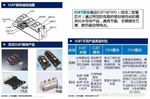 IGBT模塊是由IGBT與FWD(續(xù)流二極管芯片)通過特定的電路橋接封裝而成的模塊化半導(dǎo)體產(chǎn)品,具有節(jié)能、安裝維修方便、散熱穩(wěn)定等特點。