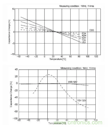 下面我們看一下C0G、X5R、Y5V三種材質(zhì)電容受環(huán)境溫度和直流工作電壓的影響。