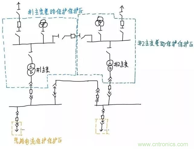 然后是變壓器連接的高壓母線。這條母線是分段的,我們希望哪段母線發(fā)生故障就只切這段母線而不切另一段,所以每段母線都需要一個(gè)單獨(dú)的保護(hù)區(qū)。按照上文的分區(qū)原則,我們可以很容易地確定出高壓母線和輸電線路的保護(hù)區(qū),如下圖: