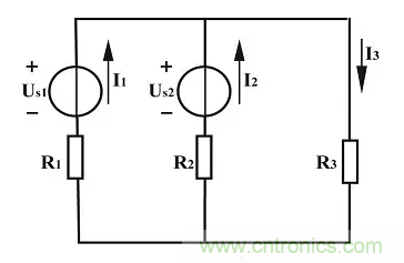 【例1】如上圖所示電路是汽車上的發(fā)電機(US1)、蓄電池(US2)和負(fù)載(R3)并聯(lián)的原理圖。已知US1=12V,US2=6V,R1=R2=1Ω,R3=5Ω,求各支路電流。