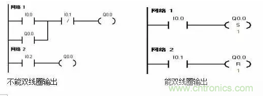 (2)梯形圖中同一編號(hào)的“繼電器線圈”只能出現(xiàn)一次,通常不能出現(xiàn),但是它的觸點(diǎn)可以無(wú)限次地重復(fù)使用。