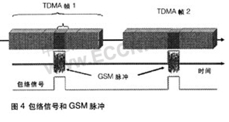 特定的手機只在屬于它的時間空當(dāng)發(fā)射。包絡(luò)信號的基本頻率是1/4.615 ms=217Hz。諧波頻率為434Hz、651Hz等。如此頻率是聽得到的。如圖4所示,為手機的包絡(luò)信號。