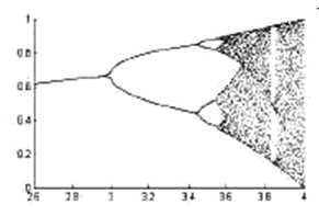 時系統(tǒng)分別產(chǎn)生周期2和周期4不動點。系統(tǒng)發(fā)生混沌的臨界值