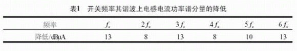 仿真結(jié)果如圖5所示,為了便于同EMC標(biāo)準(zhǔn)對照,電流功率譜采用對數(shù)表示。在開關(guān)頻率fs及各次諧波上電流的減小如表1所示。