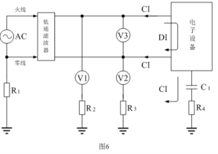 傳導(dǎo)干擾一般是通過電壓或電流的形式在電路中進行傳播的,圖6是測試電子設(shè)備產(chǎn)生傳導(dǎo)干擾的基本方法,或表示傳導(dǎo)干擾通過電源線傳輸?shù)膸追N方式。圖6中,電子設(shè)備表示干擾信號源,CI表示共模干擾信號,DI表示差模干擾信號;V1、V2、V3分別表示用儀表對干擾信號進行測量的連接方法,低通濾波器是為了便于對V1、V2、V3進行測試,而另外加接進去的;R1、R2、R3、R4分別為各電子設(shè)備的接地電阻,也包括大地之間的電阻,接地電阻一般為幾歐姆到幾十歐姆,其阻值與地線的安裝和地表面土壤結(jié)構(gòu)有關(guān);C1為電子設(shè)備對大地的電容,其容量與電子設(shè)備的體積還有地面距離有關(guān),一般為幾微微法到幾千微微法。從圖6中我們可以看出: