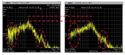 圖1.D類系統(tǒng)的近場EMI測量結(jié)果。從紅色的虛線可看出左邊的固定頻率時鐘方案和右邊的擴展頻譜調(diào)制之間的分別。