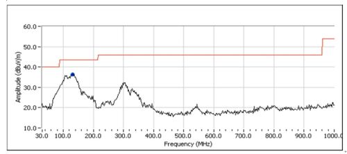 圖2.LM48310的EMI測試結(jié)果符合FCCB級限制水平。