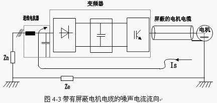 使用屏蔽電機電纜:對于高頻干擾,如果高次諧波干擾電流Is有一條合理的通道,則高頻干擾是可以得到抑制的。如果使用非屏蔽電纜,則高次干擾諧波電流Is以一個不確定的路線流回變頻器,并在此回路中產(chǎn)生高頻分量壓降,影響干擾其它設(shè)備。為使高次諧波干擾電流Is能沿確定路線流回變頻器,需要采用屏蔽電機電纜(如圖4-3所示)。電纜屏蔽層必須連接到變頻器外殼和電機外殼上,當(dāng)高次諧波干擾電流Is必須回變頻器時,屏蔽層形成一條有效的通道。這樣,高次諧波干擾電流就不會在Ze上產(chǎn)生壓降,在Zn上的壓降可由進線電抗干擾濾波器來抑制(如圖4-2中的F12)。