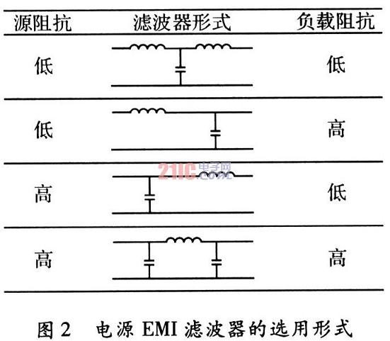 Cy用于抑制較高頻率的共模干擾信號,取值范圍一般為2200~6800 pF。常選用自諧振頻率較高的陶瓷電容。由于接地,共模電容Cy上會產(chǎn)生漏電流Ii-d。因為漏電流會對人體安全造成傷害,所以漏電流應(yīng)盡量小,通常<1.0 mA。共模電容取值與漏電流大小有關(guān),所以不宜過大,取值范圍一般為2200~4700 pF。R為Cx的泄放電阻。電源濾波器的性能很大程度上取決于其端阻抗,根據(jù)信號傳輸理論,濾波器輸入端與電源端的端接、濾波器輸出端與負載端的端接應(yīng)遵循阻抗極大不匹配原則。因此,濾波器設(shè)計時應(yīng)遵循:(1)源內(nèi)阻是高阻(低阻)的,濾波器輸入阻抗就應(yīng)該是低阻(高阻);(2)負載是高阻(低阻)的,則濾波器輸出阻抗就應(yīng)該是低阻(高阻)。對EMI信號來說,電感是高阻,電容是低阻,則有圖1中的4種濾波器選用類型。