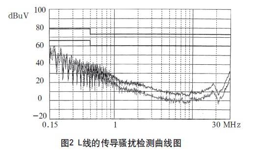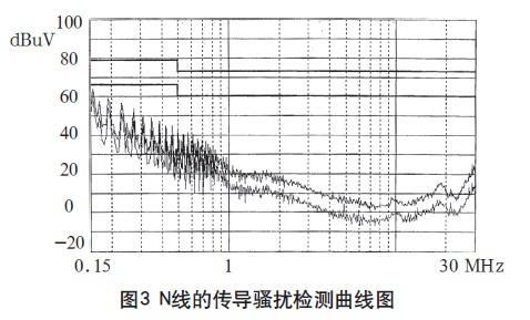 在3m法電波暗室對試驗(yàn)樣機(jī)進(jìn)行測試,其L、N線的傳導(dǎo)騷擾檢測曲線如圖2、3所示,輻射騷擾的垂直極化掃描曲線如圖4、5所示。