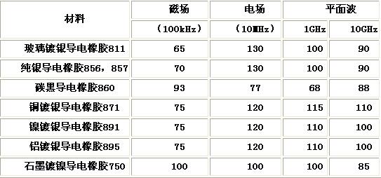導(dǎo)電顆粒屏蔽材料是將鍍銀的玻璃粒子、純銀粒子、碳黑粒子、銅鍍銀粒子、鎳鍍銀粒子、鋁鍍銀粒子、石墨鍍鎳粒子分別摻在硅或氟硅橡膠,可以擠出各種形狀,用于電磁和水汽密封。它們的屏蔽效能見表11。