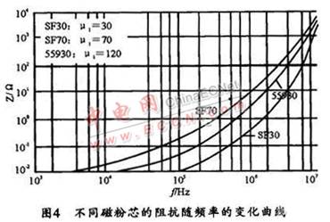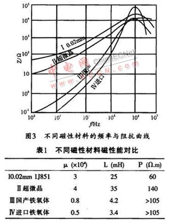 共模電感線圈如圖l中Lcl,Lc2是繞在一只磁芯上的兩組獨立的線圈,所繞圈數(shù)相同,繞向相反。這樣,當(dāng)EMI濾波器接入電路后,兩組線圈產(chǎn)生的磁通在磁芯中將相互抵消,故不會使磁芯飽和。對于干擾信號而言,共模磁芯一般工作在低磁場區(qū)域,所以,共模濾波電感選用的磁性材料要求具有較高的初始磁導(dǎo)率μi。如果只針對濾波器的插入損耗這一指標(biāo),則初始磁導(dǎo)率μi越高,濾波電路呈現(xiàn)的感抗就越大,所得到的插入損耗指標(biāo)就越好。但在整個電路中,還要綜合考慮磁性材料在電路中的其它特性,如頻率阻抗特性、居里溫度、磁材的形狀等等。μi值不同的各種磁性材料,在不同頻率下的阻抗特性也不一樣,故要根據(jù)所需要的頻率范圍來選取合適μi值的磁性材料。圖3所示是不同類型的高μi軟磁材料在同樣條件下的頻率與阻抗關(guān)系曲線,該曲線反映出電感磁芯的插入損耗變化趨勢。其它的性能參數(shù)(如電感值、體電阻等)如表1所列。