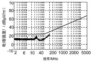 對RE102 試驗項目進行觀察,發(fā)現(xiàn)測試結(jié)果圖的超標點為24 MHz、36 MHz 兩點,而這兩點分別是12 MHz 頻率點的二三次諧波。為了找到這一頻率點的元器件,對機箱內(nèi)各單元進行了分析,發(fā)現(xiàn)控制保護單元中有一個12MHz 晶振,由于晶振屬于高噪聲元器件,能夠產(chǎn)生較強的輻射,從而使其周邊充滿著近場輻射場。如果輻射場內(nèi)有器件或走線,晶振及其諧波信號將耦合到器件或走線上而輻射出去;再者又發(fā)現(xiàn)控制保護單元的PCB 板未采取就近接地措施,只是通過一根長引線和機殼地相連,造成信號的環(huán)路面積增大,產(chǎn)生了很強的輻射,所以對控制保護單元采取措施應(yīng)該是行之有效的。首先對晶振進行屏蔽且屏蔽體就近接地,弱化輻射發(fā)射強度; 然后控制保護單元的PCB 板同樣采取就近接地措施,并且在屏蔽盒出口處的信號線上安裝一個鐵氧體磁環(huán),可以將不需要的高頻干擾抑制掉。通過采取以上措施后,RE102 試驗指標合格,如圖3 所示。