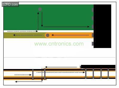 流經(jīng)所布線路的所有電流都有相等的回流。耦合策略固然很多,不過回流通常流經(jīng)相鄰的接地層或與信號線路并行布置的接地。在參考層繼續(xù)時,所有耦合都僅限于傳輸線路,一切都非常正常。不過,如果信號線路從頂層切換至內(nèi)部或底層時,回流也必須獲得路徑。