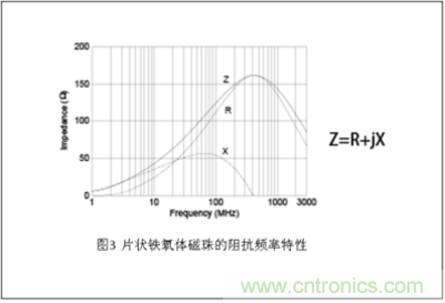 一般來說,片狀鐵氧體磁珠是以100MHz的阻抗值來決定其規(guī)格的。但與此同時, 也存在著諸多擁有相同阻抗值的不同產(chǎn)品,這是因?yàn)樗鼈兊那€形狀各不相同。圖4所示的就是其中一例。BLM18AG601SN1與 BLM18BD601SN1都是100MHz阻抗值為600Ω的片狀鐵氧體磁珠,但從它們的阻抗波形可以看出,與BLM18AG601SN1較為平穩(wěn)上升 的曲線相比,BLM18BD601SN1的曲線則呈急速上升的趨勢。