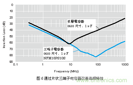 圖6中對(duì)片狀三端子電容器與片狀二端子多層電容器的插入損耗特性進(jìn)行了比較。兩種元件的靜電容量相同,因此在低頻范圍內(nèi)特性相同。但是二端子電容 器在頻率超過10MHz后性能便開始下降,而三端子電容器則在超過100MHz后才會(huì)出現(xiàn)性能下降。由于片狀三端子電容器在一定程度的高頻范圍內(nèi)都不會(huì)出 現(xiàn)性能下降,因此它適用于需要去除高頻干擾的情況。