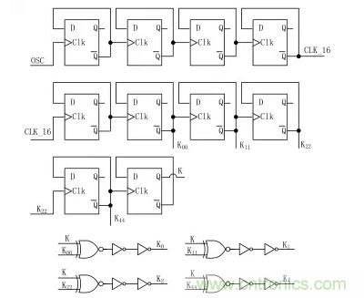 本文中所設(shè)計(jì)的頻率抖動(dòng)控制模塊是通過計(jì)數(shù)器來控制圖 2 中 M6~ M12開關(guān)管的通斷來周期性的改變充放電電容的大小來實(shí)現(xiàn)的。頻率抖動(dòng)控制模塊的電路圖如圖 3 所示,由7 個(gè) D 觸發(fā)器串聯(lián)構(gòu)成 512 分頻觸發(fā)器,第 8 個(gè) D 觸發(fā)器的輸出信號(hào)加入到異或門用于實(shí)現(xiàn)計(jì)數(shù)器 K4,K2,K1,K0加減法計(jì)數(shù)切換,保證加入到張弛振蕩器中的電容不會(huì)出現(xiàn)瞬時(shí)的大容值的變換,從而引起振蕩器的振蕩頻率有過大的變化。本文中所設(shè)計(jì)振蕩器的中心頻率為100 kHz,頻率抖動(dòng)范圍為±4 kHz,頻率從 96 kHz,100 kHz,104 kHz 周期性地變化,頻率抖動(dòng)周期為 5 ms。