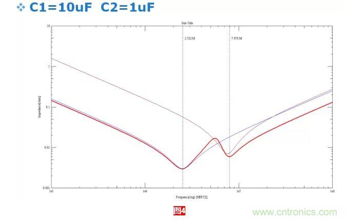 不同種類電容的并聯(lián)如圖4所示,兩種電容并聯(lián),會(huì)出現(xiàn)兩個(gè)諧振頻率點(diǎn)。同時(shí)還會(huì)出現(xiàn)一個(gè)反諧振頻率點(diǎn),這個(gè)反諧振頻率是電容設(shè)計(jì)的難點(diǎn)之一。