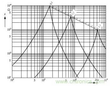 由圖中可以看出,電感線圈的阻抗開始的時候是隨著頻率升高而增大的,但當(dāng)它的阻抗增大到最大值以后,阻抗反而隨著 頻率升高而迅速下降,這是因為并聯(lián)分布電容的作用。當(dāng)阻抗增到最大值的地方,就是電感線圈的分布電容與等效電感產(chǎn)生并聯(lián)諧振的地方。圖中,L1 > L2 > L3,由此可知電感線圈的電感量越大,其諧振頻率就越低。從圖2中可以看出,如果要對頻率為1MHZ的干擾信號進行抑制,選用L1倒不如選用L3,因為 L3的電感量要比L1小十幾倍,因此L3的成本也要比L1低很多。
