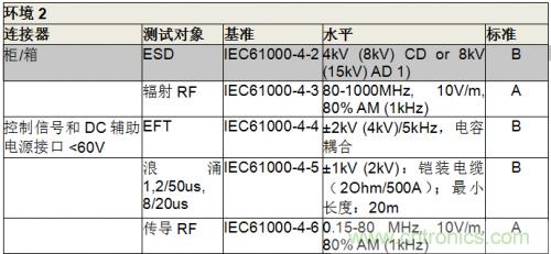 TI工程師測(cè)試IEC61800-3標(biāo)準(zhǔn)來(lái)獲取環(huán)境規(guī)范(表1)。該設(shè)計(jì)使用鎧裝連接器和鎧裝電纜(長(zhǎng)度>30m)。標(biāo)準(zhǔn)的定義見(jiàn)表2。
